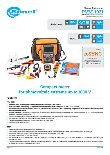 PVM-1021 je kompaktní měřič fotovoltaických systémů s velkým počtem měřicích funkcí. Funkce se volí otočným přepínačem. Další parametry se nastavují tlačítky umístěnými na krytu. Všechna tlačítka a grafický displej jsou podsvícené, což výrazně usnadňuje práci ve stinných místech, např. při měření pod pozemními fotovoltaickými systémy. Velká paměť výrazně zkracuje dobu přípravy dokumentů po měření.
